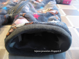 Nostan saumurin ja ompelukoneen (jota en lopulta edes tarvi) pöydälle, nopean pikkujutun ommellakseni. Saan kankaan saumurin paininjalan alle - ja itkuhälyttimestä kuuluu ääntelyä. Onneksi ongelma on vain tipahtanut tutti ja unet jatkuu. Saan ompeluni kymmenessä minuutissa valmiiksi. Käännän. Silitän. Ompelen muutaman piston käsin. Valmista!